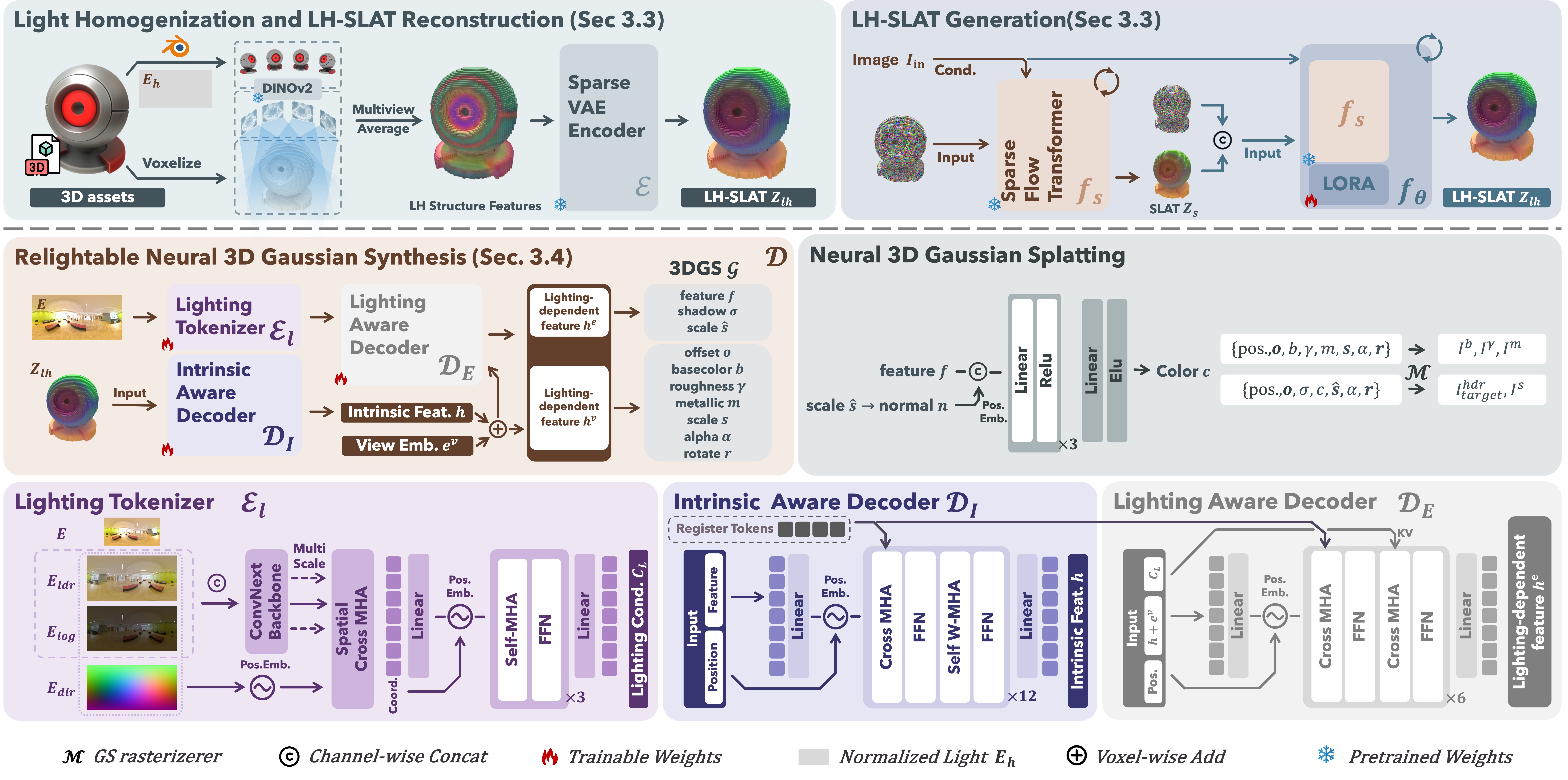 Pipeline of NeAR. Top: Light Homogenization extracts a Lighting-Homogenized Structured 3D Latent (LH-SLAT) from a casually lit input image. The right side shows the pipeline for generating LH-SLAT from a single image: we first recover a shaded SLAT, then perform illumination homogenization in voxel space. Bottom: Relightable Neural 3DGS Synthesis generates a relightable 3D Gaussian Splatting (3DGS) field conditioned on the LH-SLAT, target illumination, and target viewpoint. The decoded 3DGS encodes geometry, appearance, and light–material interactions, and is rendered into the final relit image.